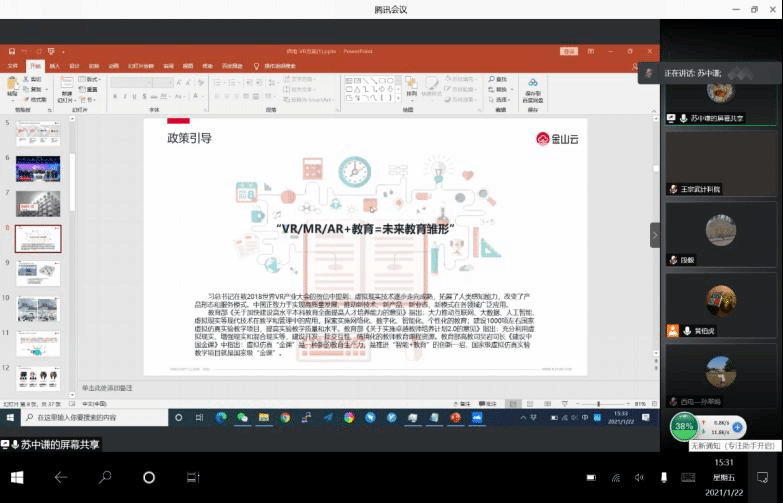 接着,双方就数字媒体实验室建设等议题进行了深入的交流。数字媒体专业负责人付少峰老师介绍了我院数字媒体专业的发展历史、毕业生就业情况以及专业建设的相关需求,付老师提到西电数字媒体专业培养的人才更偏技术,基础扎实、能力过硬,受到用人单位欢迎,希望双方合作应深入且具备可持续性。金山云合作伙伴、触角科技CEO苏中谦则从政策引导、合作模式、XR实验中心、多场景教学模式、教学内容设计等方面详细介绍了公司在数字媒体实验室建设方面的经验和案例。金山云AIoT事业部高级商务经理任阿伟介绍了正在设计的竹园学生公寓创新实验室的智能化建设方案,该创新实验室的建设旨在为学生提供一个好用、易用、能自主管理、可参与开发的多功能智慧实验场所,方案以“金山云”和“小米”软硬件设施为基础,技术先进、功能全面。最后,金山云高级技术经理丁明辉介绍了“西电-金山云人工智能产学研算力中心”建设方案,该方案面向疫情影响下的实验教学和未来的智慧教育,借鉴金山云在教育领域已经取得的一站式在线教育经验构建线上高性能实践教学环境,可优化中心现有智慧实验室管理环境,提升管理效率。