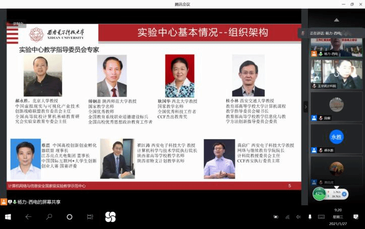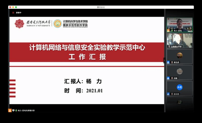 (通讯员 段毅 黄伯虎)1月27日上午,计算机网络与信息安全国家级实验教学示范中心通过腾讯会议举行了“工作汇报及教学指导委员会线上会议”。参加此次会议的教学指导委员会专家有:北京大学郝永胜教授、陕西师范大学傅钢善教授、西北大学耿国华教授、西安交通大学桂小林教授、中国高校创新创业孵化器联盟理事长蔡震、betway必威西汉姆联官网崔江涛教授和苗启广教授。学校及学院参会代表有:学校实验室与设备处副处长(主持工作)韩卿、学院教学副院长万波,实验示范中心主任杨力、副主任贾文、王宗武、黄伯虎、张跃宇及实验示范中心教师等30余人。本次会议由杨力主任和郝永胜教授共同主持。
