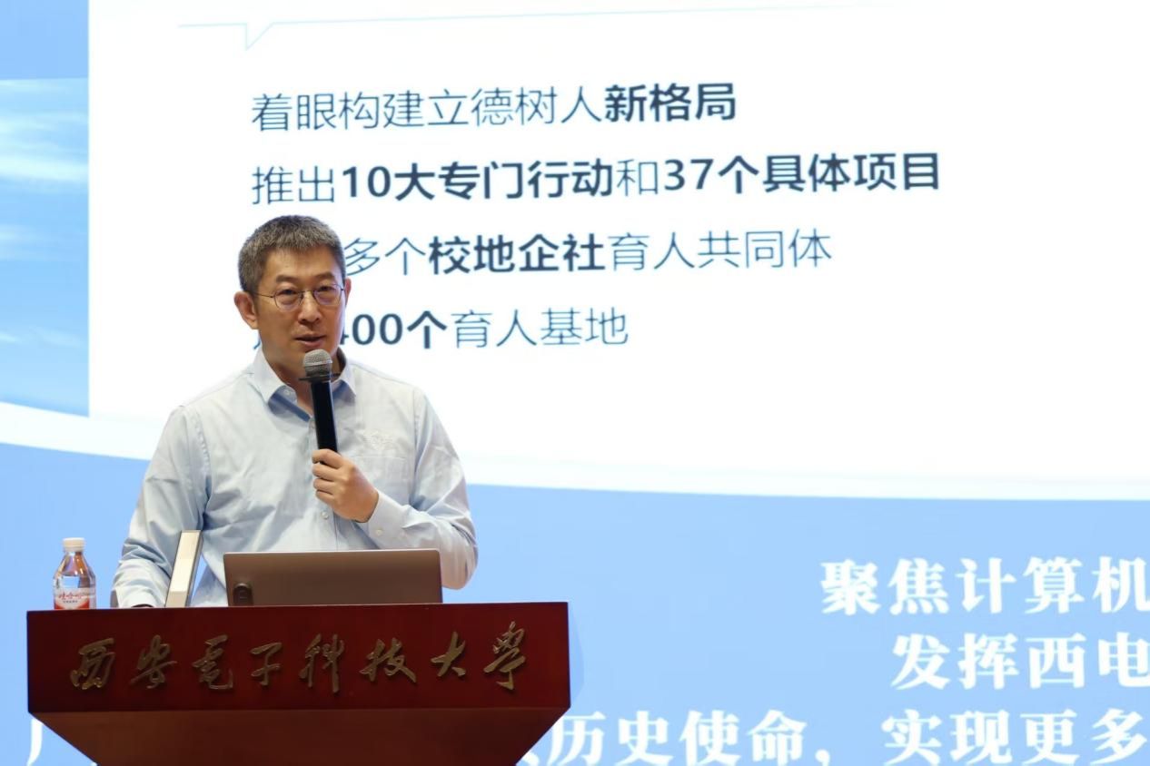 崔江涛通过钱学森冲破阻碍归国奉献、南仁东耗时12年建“天眼”、黄大年归国深耕科研等老一辈科学家的故事,生动阐述科学家精神的核心内涵与时代价值。他讲到,betway必威西汉姆联官网延续着中国高校最长的红色根脉,老一辈计算机人更是在“无专业课老师、无专业实验设备、无训练计划”的条件下,为我国重大战略任务做出卓越贡献,一代又一代西电人、计科学子,始终以爱国主义为底色,发扬科学家精神,前赴后继、接续奋斗。